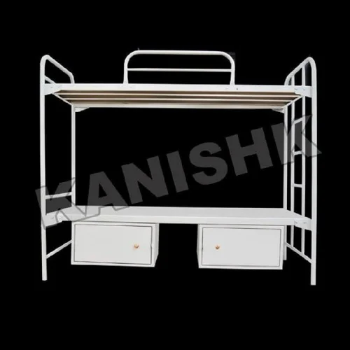 White bunker cot bed designed for hostel use. Features integrated box storage for added convenience. Durable construction for demanding environments. Available in white.