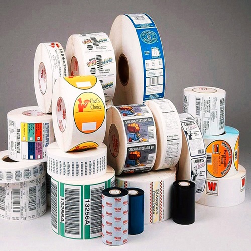 White paper self-adhesive labels, 4"x6" size, on a 28mm core. Customizable packaging in sheets or rolls. Printed pattern, paper material.