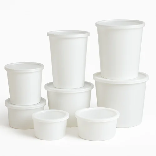 Milky white round plastic container, 250 gm capacity. Disposable and plain pattern. Suitable for event and party supplies or as packing material.