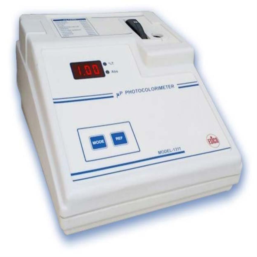 Semi-automatic white plastic colorimeter for laboratory use. This device has a temperature range of -20 to 200 degrees Celsius. Material is durable plastic.