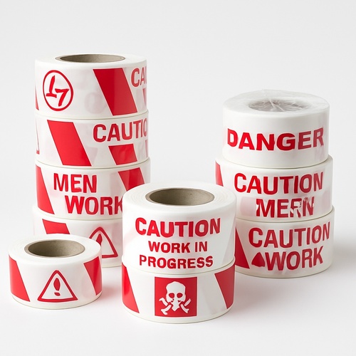 Durable barricading tape in white and red for enhanced safety. Clearly marks hazardous areas and directs traffic, essential for construction and event management. Ensures visible warnings.
