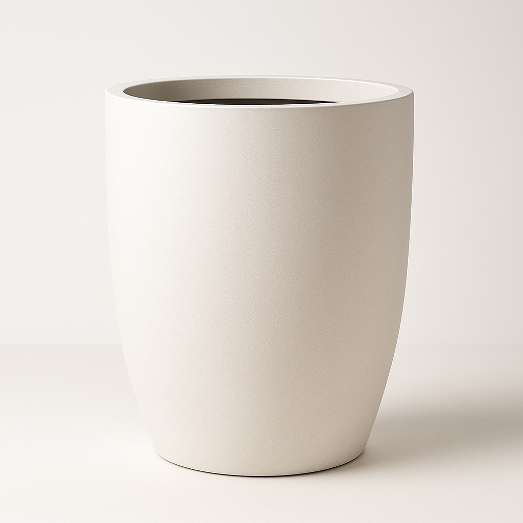 30-inch round white fiberglass planter. Available in shiny or matte finishing with plain or textured patterns. Made in India.