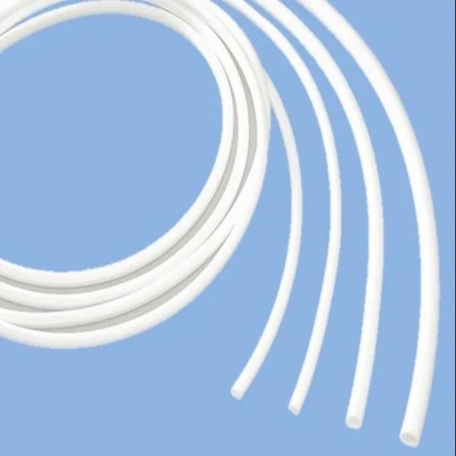 White PTFE tubing supplied on a roll. Features ID 1.6-25mm, OD 3.2-28mm, and 0.5-1.5mm wall thickness. Suitable for various sealing applications.
