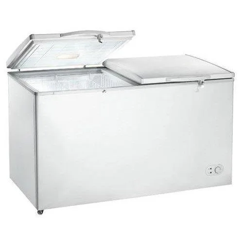 1000L capacity double door deep freezer, white stainless steel body. Operates on 230V, 50Hz electric power. Ideal for supermarket applications with rectangular shape.