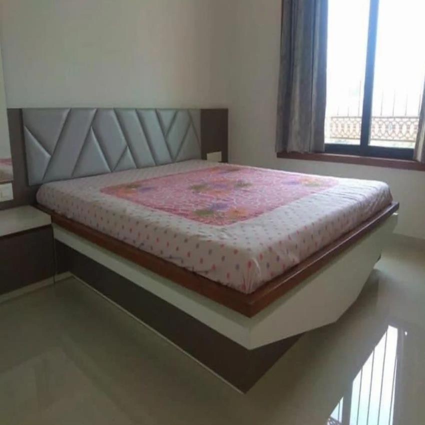 White Teak Wood headboard for double beds at home, with hydraulic storage. Laminated finish, folded design. Weighs 300kg, 7x6 width. Made in India.