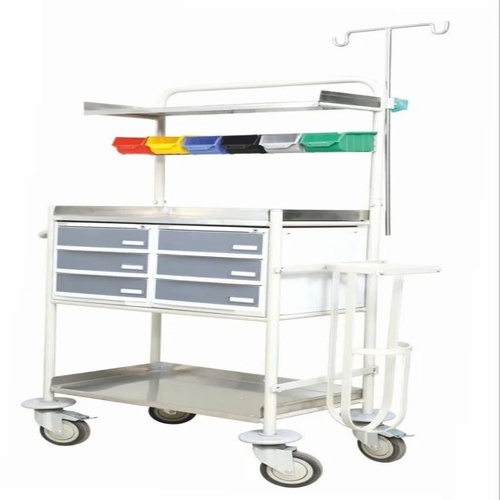 MS emergency cart, 960x490x1545mm, polished finish, 6 drawers, and 4 wheels. Manufactured in India for new item sales.