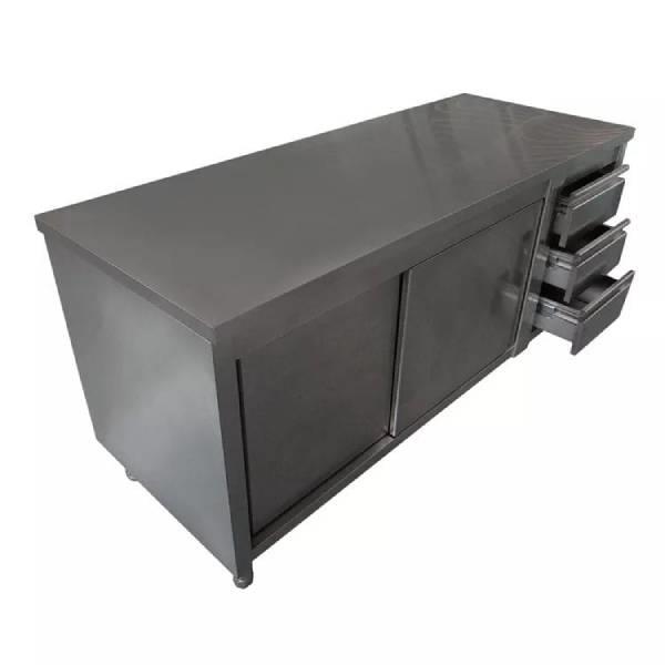 Commercial wooden cabinet with sliding door and drawers. Features 3 shelves. Suitable for various commercial applications.