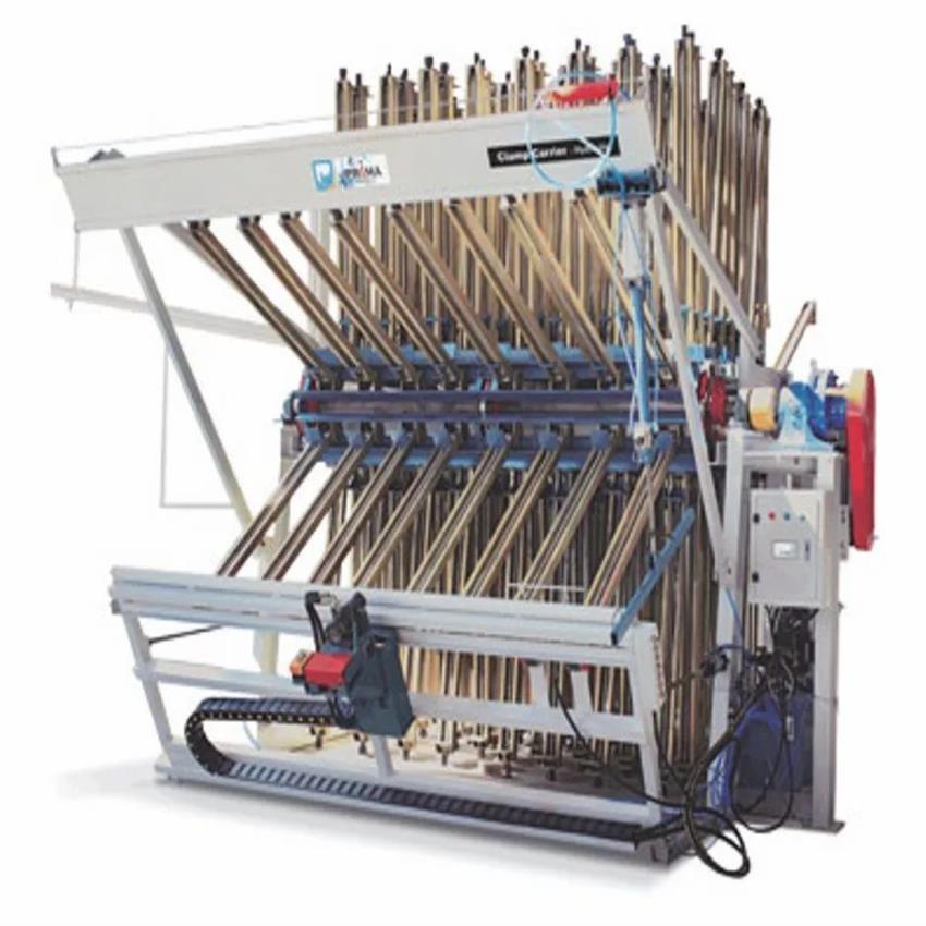 Woodworking hydraulic clamp machine featuring 5HP hydraulic motor, 1.5HP revolving motor, 8 clamping rows, and 10-90mm max clamping thickness. Dimensions: 2600MM X 1250MM, Weight: 6000KG.