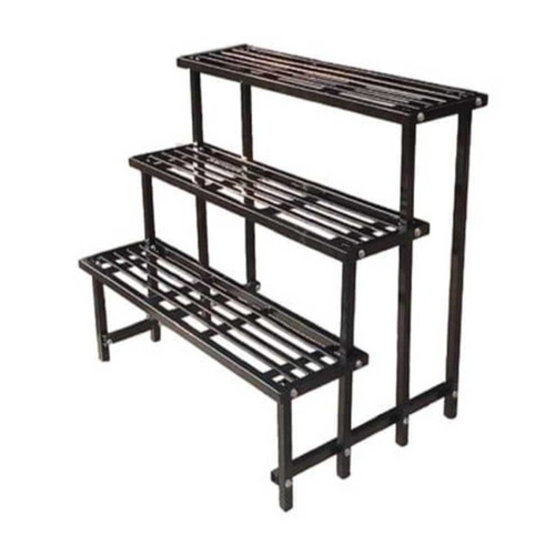 Three-step wrought iron flower stand, 10mm thick. Rectangular shape in black, designed for garden use. Minimum order quantity of 100 units.