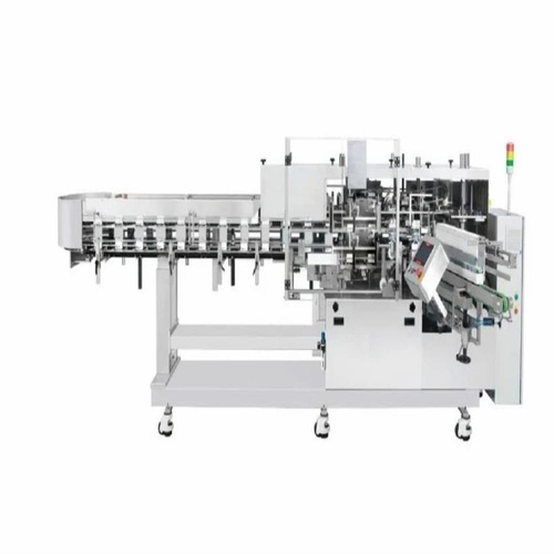 Vertical cartoning machine, SS material, 100 packs/min capacity. Features 8 CFM, 4.5 kg/cm2 air pressure, 50 Hz frequency, and 1200 Kg net weight.
