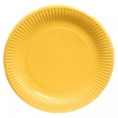 Eco-friendly, plain yellow disposable plate. Circular shape, made from paper material. Suitable for events and parties. Offers a sustainable choice for gatherings.
