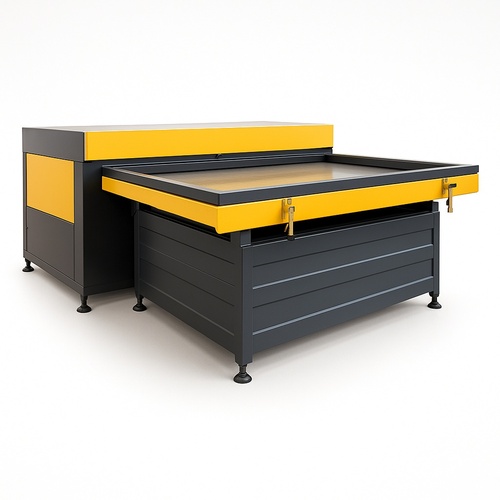 Semi-automatic, METAL Yellow Vacuum Forming Equipment for PVC. 25HP power, 9648 max forming area. Suitable for INERTIAL product types. Efficient industrial manufacturing solution.