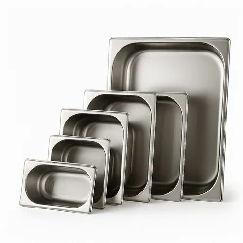 Silver stainless steel GN pans for kitchen use. Rectangular shape, new condition, with a production capacity of 12 units. Ideal for professional and home kitchens.