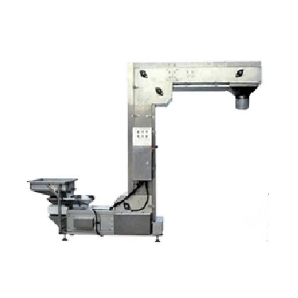 Automatic steel Z type bucket conveyor machine driven by chain. Lifts material vertically for feeding at height. Capacity: 2 meter cube, Height: 3.5-4.5m, Power: 550W.
