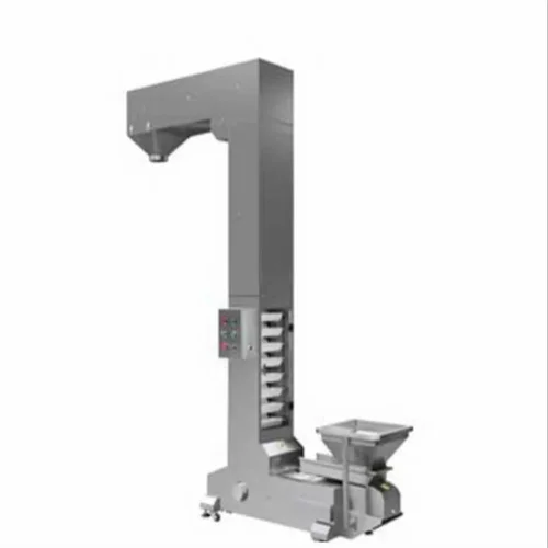Z-type bucket lifting device with 2-4 litre bucket capacity. Handles material feeding up to 1200mm, output 200-600 L/min. MOC: MS Powder Coated/SS304.