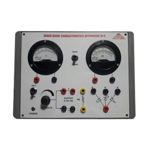 Dual meter apparatus for Zener Diode characteristics. Features 15/1.5mA ammeter, 0-15VDC/150mA power supply, and 0-15 Volt voltmeter. Includes 5.1, 8.2, 12V Zener diodes. Size: 11"x9"x3".