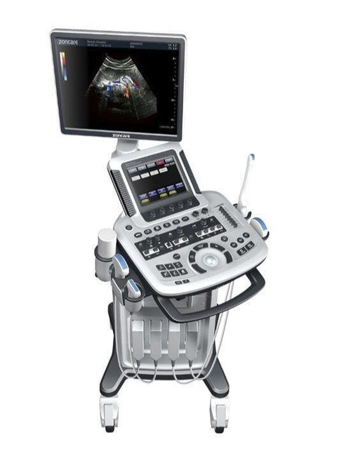 Zoncare ZQ9902 ultrasound machine for general imaging. Features a 15-inch LED monitor with a 30 CM display depth. Equipped with 3 connectivity ports.