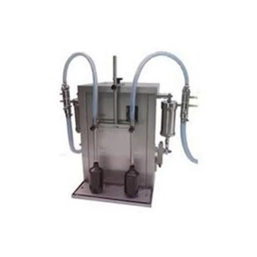 Manual liquid filling machine with 0.5 HP power. Fills 20 jars/min with volumes from 50 ml to 1 ltr. Dimensions: 400x600x650mm.