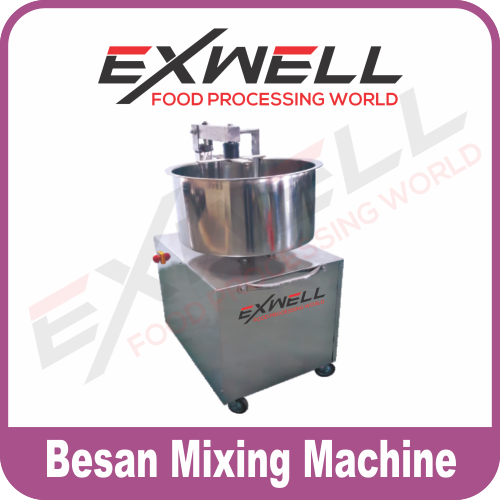 Semi-automatic commercial besan mixing machine with 1 HP motor. Stainless steel contact parts, single-phase power, 50Hz frequency. Dimensions: 21x33x15 inches. 1440 RPM motor.
