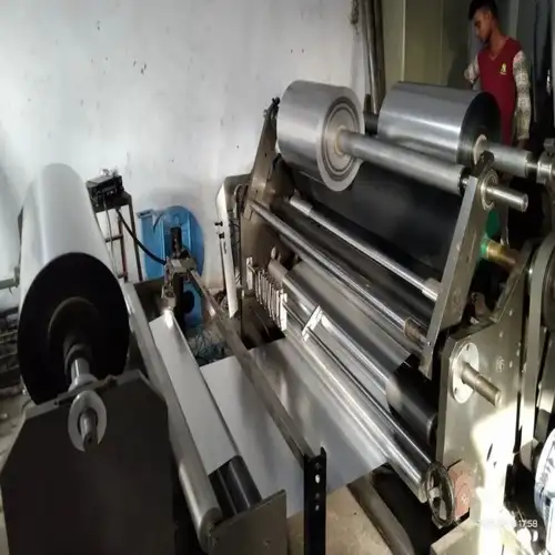 Automatic 10 hp Mild Steel surface slitter for flexible packaging. Production capacity: 8 ton/day. Max web width 1350mm, reel diameter 1000mm, AC vector drive.