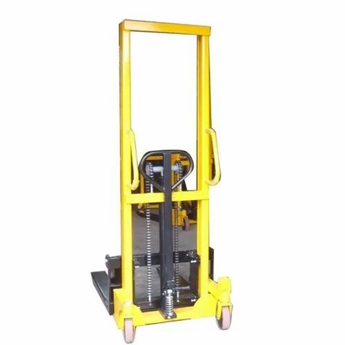 This manual pallet stacker features a 100 kg rated load and mild steel construction. Ideal for industrial applications, it measures 1000 mm fork length and 800 mm fork width, reaching 6.5 feet height.