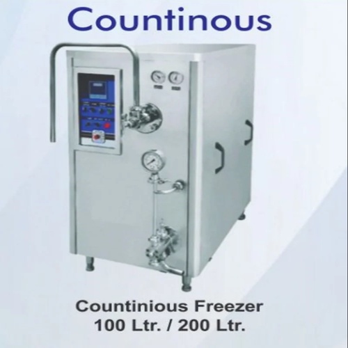Electric 100 L continuous freezer for ice making, operating at 440 V and 50 Hz. Features a silver SS body and single door.