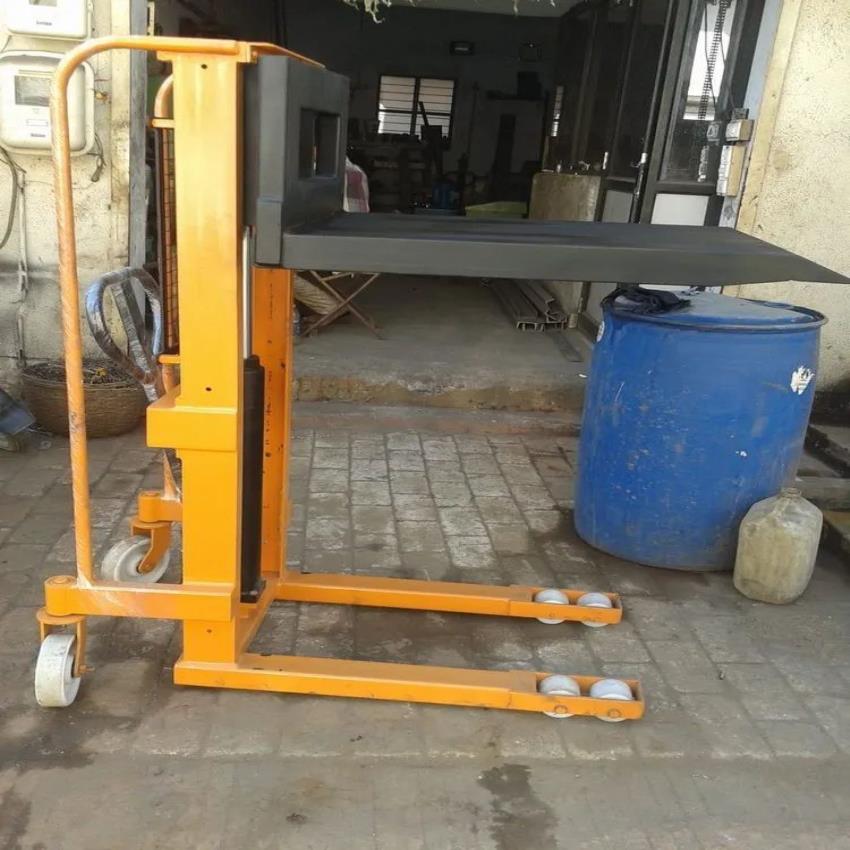 Manual operated counter balance stacker machine with 1000 kg rated load capacity. Features mild steel construction, 1150 mm fork length, and 1000 mm lifting height for material handling.