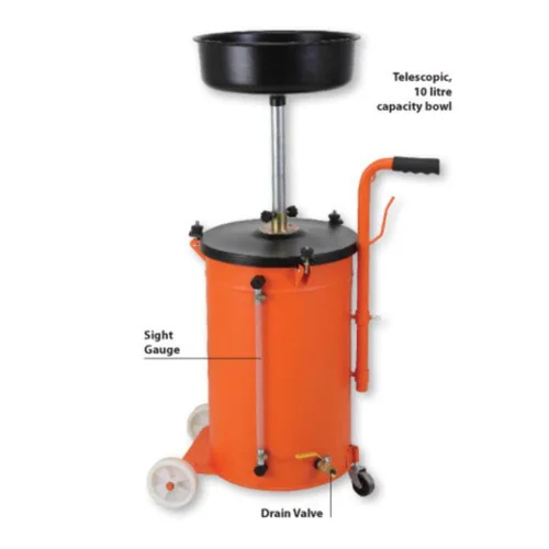 This industrial-grade, automatic oil drainer has a 10-liter tank capacity. Designed for efficient fluid collection in various industrial applications. Made in India.