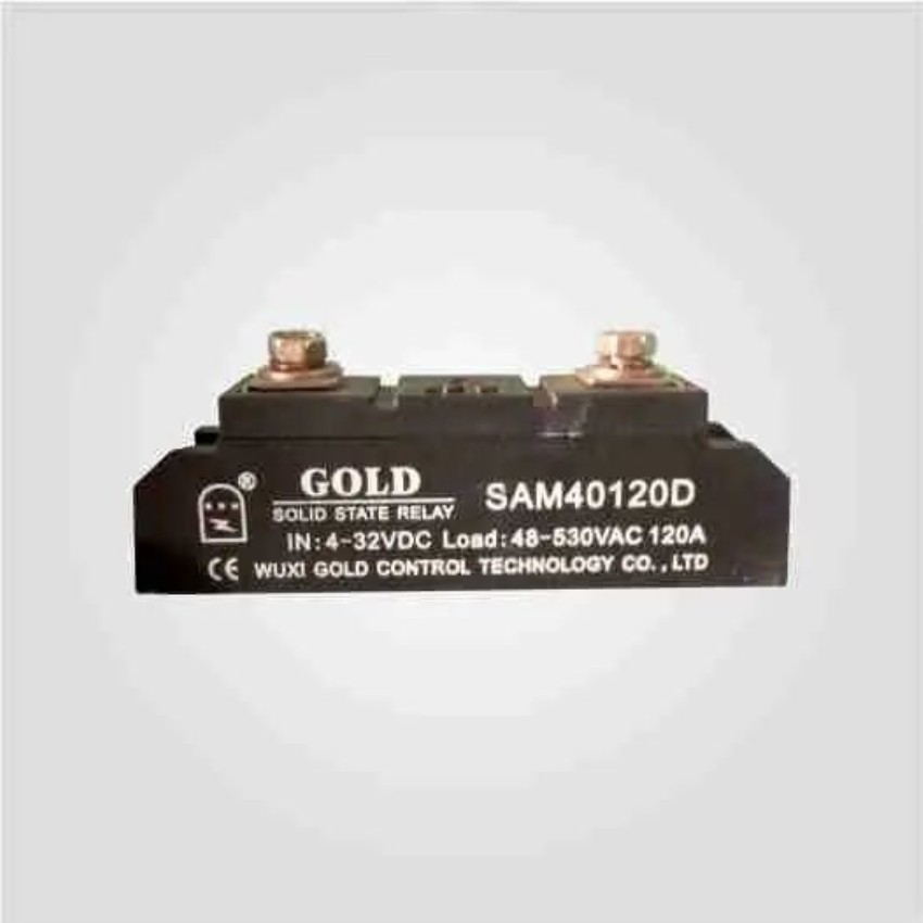 Solid State Relay (SSR) for three-phase applications. Rated for 120 Amps. Ideal for heavy-duty industrial power control.