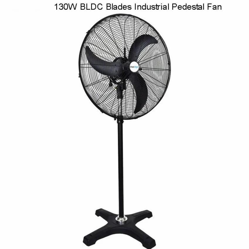 750 mm industrial pedestal fan with 130W BLDC motor. Delivers 18000 CMH air volume with 3 blades and 1400 RPM max speed. 2-year warranty.