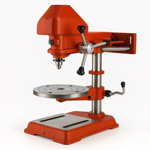 Bench drilling machine with 16mm chuck capacity. Features 13mm drilling diameter, 25mm drilling capacity, 2 HP motor, and MT2 spindle taper. Table adjusts 45 degrees.