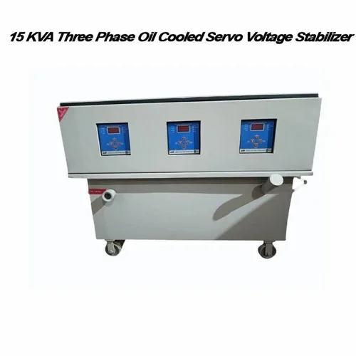 Three phase, 15 KVA oil-cooled servo voltage stabilizer. Features digital control and grey finish, ideal for industrial applications with stable voltage output.
