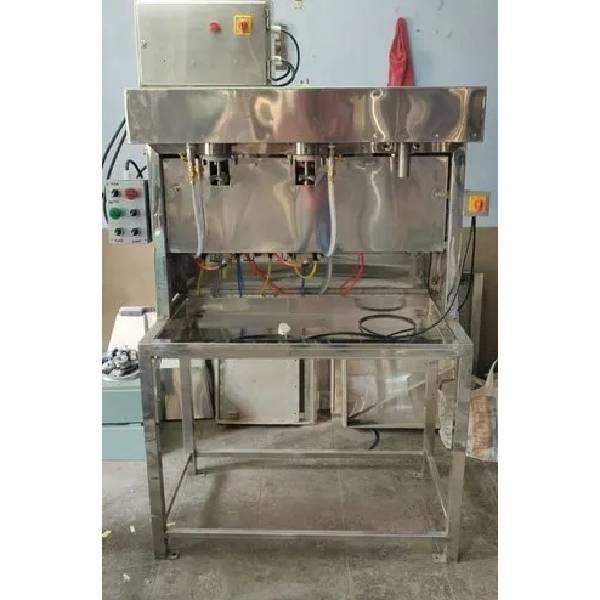 Semi-automatic soft drink filling machine with 2 heads. Fills 300-1000 bottles per hour. Operates on 1-3 HP power.