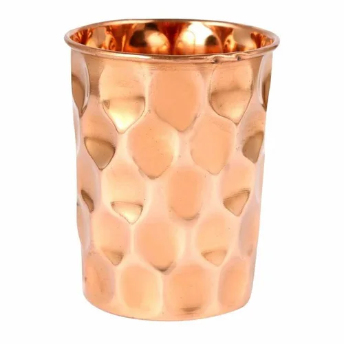 This 200ml copper glass features a hammered design and a cylindrical shape. Ideal for drinking water, this medium-sized glass is sold as a single piece.