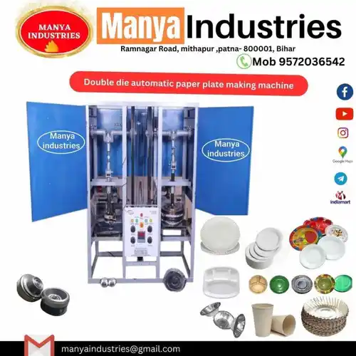 Fully automatic paper plate making machine. Features 5 HP power, 230V voltage, and 1000 piece/hour production capacity. Uses PE coated paper raw material with MS body.