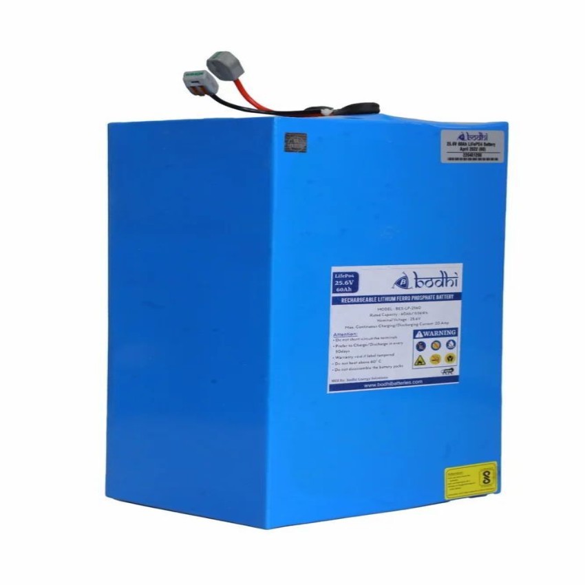25.6V, 60Ah LiFePO4 battery designed for solar, medical, telecom, and railway applications. Features a 20 Amp discharging current. Available in stock, Made in India. Model: BES-LP-2560.