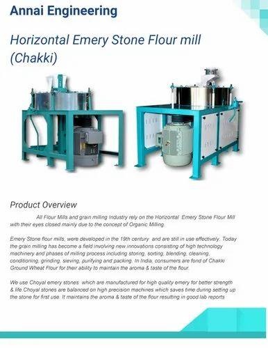 Commercial semi-automatic atta chakki with 25hp motor and 32" horizontal emery stone. Processes 0-4 ton/day, multigrain capable. New condition.