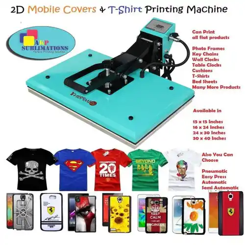 Manual 2D mobile case and cover printing press. Size: 16*24 inches. Ideal for T-shirts, MDF, mobile covers, and frames. Capable of 1000 production.