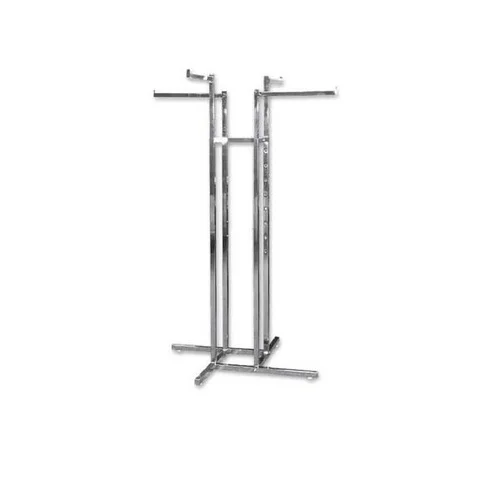 Powder-coated stainless steel free-standing 4-way clothing rack. Height 150 cm. Durable metal surface finishing for effective garment presentation.