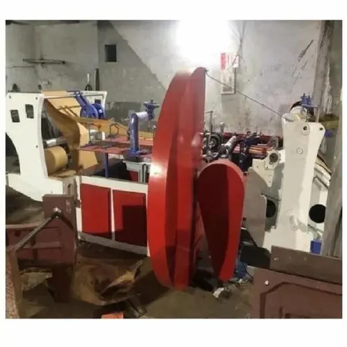Automatic paper bag making machine with 42-inch roll size. Features MS construction, 5 ton/day capacity, single phase, 220V electric power, and 50-100 meters/min speed.