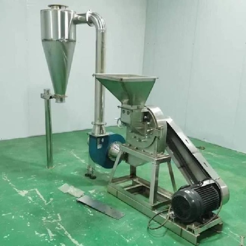 Automatic 7 HP grain grinding machine with 300kg/hr capacity. Features SS 304 contact parts, 5 Kwh power consumption, and three-phase electricity connection. Painted finish.