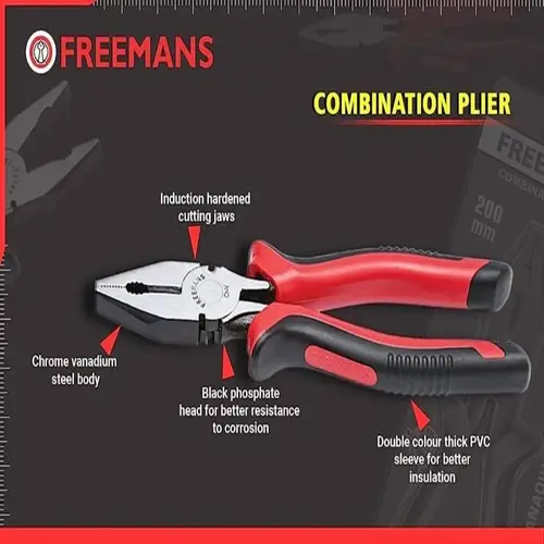 8-inch industrial combination plier, crafted from Chrome Vanadium steel. Features red and blue handles for industrial applications. Lifetime warranty.