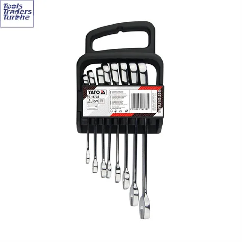 This 8-piece combination ratchet spanner set, made from CrV steel, features a plastic hanger for convenient storage. Ideal for hand tool applications requiring versatile wrenching capabilities.