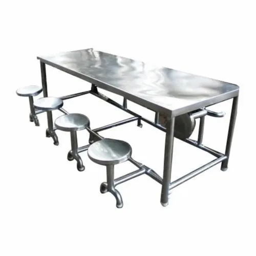 Stainless steel canteen furniture for hotels, seating 8 people with stools. Features SS finish and is made in India.