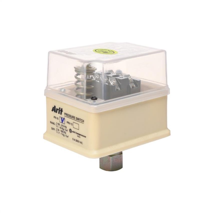 Industrial air compressor pressure switch, model PR-15. Features a 9 Amp current rating and 500 V AC voltage. Constructed from plastic in livery color.