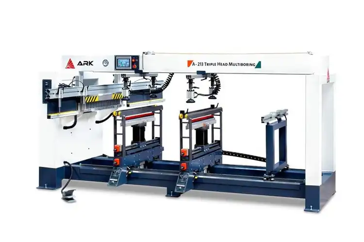 The A-213 is a semi-automatic triple head boring machine with 6 HP power and 70mm drilling depth. Operates on 415V, 3-phase power with 6 Bar pneumatic pressure.