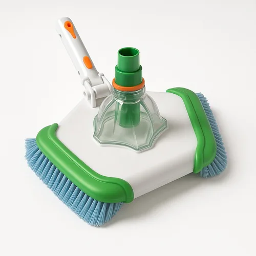 ABS swimming pool cleaning head in white and green. Features 270 mm roller width and 30 mm pipe hole. Made in India with nylon bristles for effective pool cleaning.