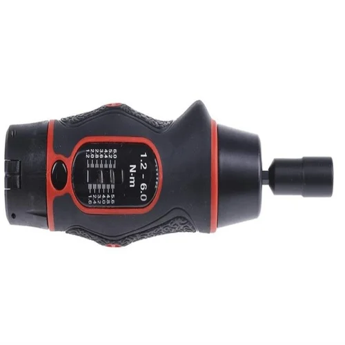 Adjustable torque screwdriver with 1/4" drive size. Features reverse rotation and a torque range of 1.2-6 Nm. Made of plastic, black color, with a 1-year warranty.
