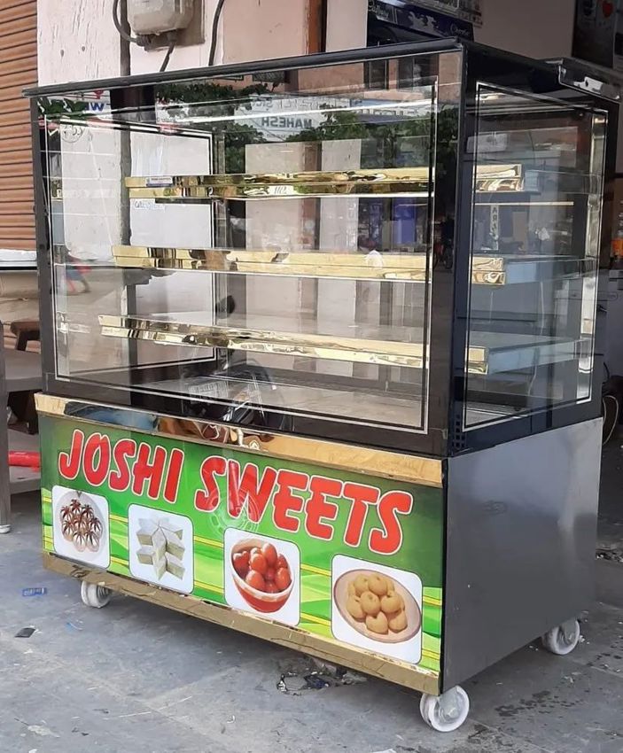 This air-cooled glass bakery display counter, made in India, features 3 shelves and is available in various shapes. It's suitable for diverse commercial applications.