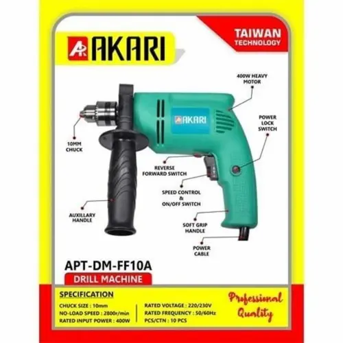 This Akari drill device features a 10mm chuck size and a 10mm drilling diameter. It operates at 2800r/min no-load speed and uses 400W voltage. Comes with a 6-month warranty.